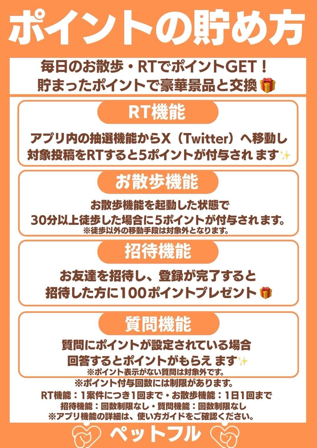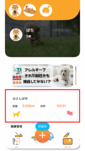 ホーム お散歩機能の説明 お散歩でのポイントの貯め方はこちら ペットフル_お散歩機能 お散歩機能の説明 【ステップ1】 ホーム画面から「散歩」を選択 【ステップ2】 「+」ボタンをタップ 【ステップ3】 お散歩するペットを選択。複数選択も可能。 選択したら「お散歩スタート」をタップ 【ステップ4】 歩くと距離と時間が増加。 お散歩が終わったら、ホーム画面の「おさんぽ中」をタップ 【ステップ5】 「完了」をタップ 30分以上散歩すると、1日1回5ポイントゲット!