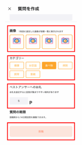 カテゴリーを選択し、ベストアンサーへのお礼ポイント数を入力。